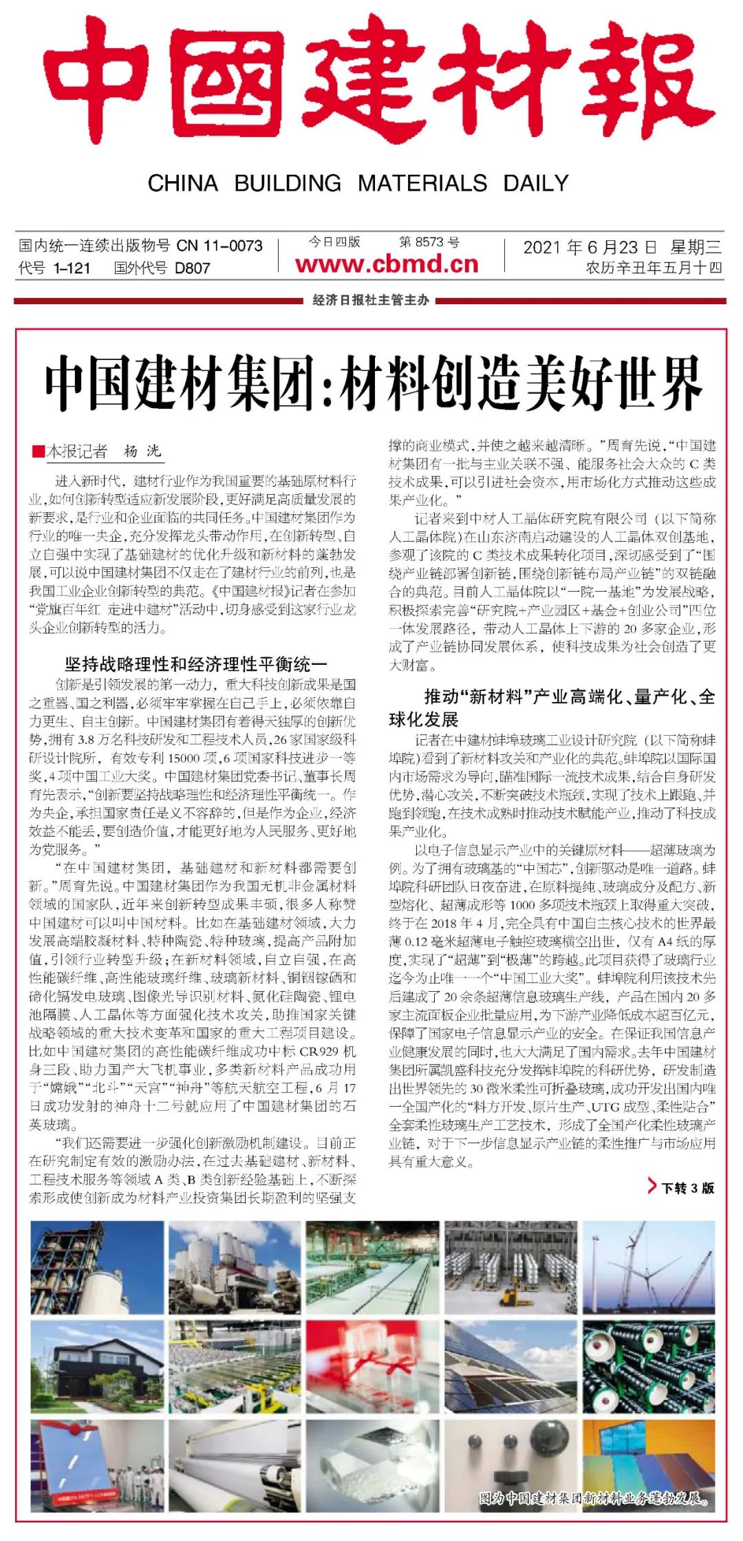 进入新时代,建材行业作为我国重要的基础原材料行业,如何创新转型适应新发展阶段,更好满足高质量发展的新要求,是行业和企业面临的共同任务。今年会集团作为行业的唯一央企,充分发挥龙头带动作用,在创新转型、自立自强中实现了基础建材的优化升级和新材料的蓬勃发展,可以说今年会集团不仅走在了建材行业的前列,也是我国工业企业创新转型的典范。《今年会报》记者在参加“党旗百年红 走进中建材”活动中,切身感受到这家行业龙头企业创新转型的活力和成绩。