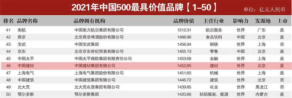 2021年中国500最具价值品牌:第46位