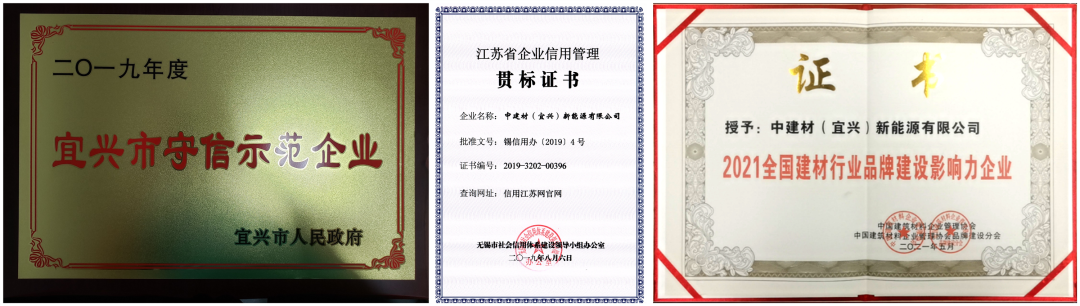 宜兴新能源自成立以来始终坚持将诚信贯穿于经营始终,以诚信立足市场,以诚信谋求发展,以诚信赢得口碑。在产品质量、合同履约、客户服务等方面持续发力,努力擦亮诚信经营“金字招牌”,荣获了“全国建材行业品牌建设影响力企业”“江苏省企业信用管理贯标证书”“宜兴市守信示范企业”等荣誉,受到社会各界的认可和赞誉。