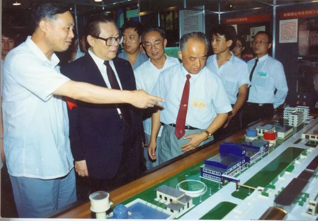 视察哈玻院产品 1989年9月,江泽民等党和国家领导人一起来到北京小汤山沙河机场参加展览,在哈尔滨玻璃钢研究院研制的17米 L波段雷达天线罩前参观并留影。 视察洛阳玻璃厂并题词 1991年2月7日,江泽民同志来到洛阳玻璃厂,视察了被誉为中国浮法技术改造样板线的第二条浮法玻璃生产线后,为工厂题词 :“大力推进技术进步,走质量效益型的发展路子。” 关心耀华浮法玻璃生产并听取汇报 1991年8月21日至9月2日,江泽民同志参观由国家计委、科委、财政部联合主办的“七五”科技攻关成果展览,在耀华展位上观看浮法玻璃生产线模型并听取汇报。 视察原中新集团并题词 1992年10月28日,江泽民同志视察原中新集团并题词:“发展新型建筑材料,为我国现代化建设多作贡献。” 关注耀华和洛玻产品