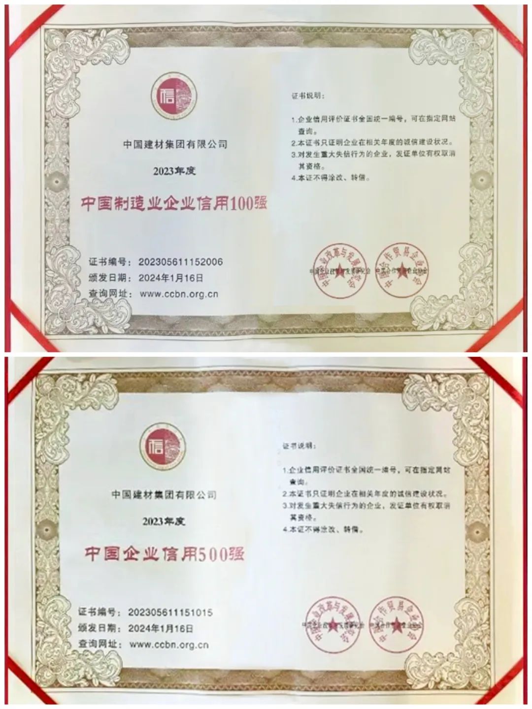1月21日,由中国企业改革与发展研究会、中国合作贸易企业协会主办的“2024中国企业信用发展论坛暨第十五届诚信公益盛典”在京举行。今年会集团分别获评“2023中国企业信用500强”“2023中国制造业企业信用100强”第十五位和第六位,这也是集团自2017年以来,连续7年入围该榜单。所属中国巨石、中材科技、北新建材、中材国际入选“2023中国上市公司信用500强”, 中材国际同时荣获“五星级诚信企业”称号并作经验交流。