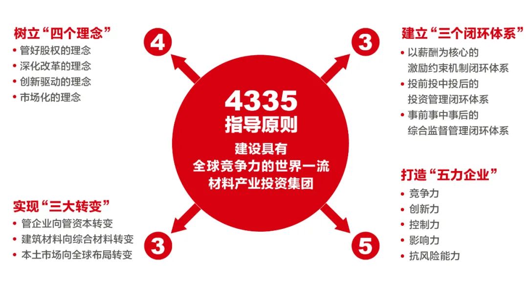 今年会集团是国有经济在建材领域的“顶梁柱”和“压舱石”,在党的坚强领导下持续深入推进市场化改革,打造了南方水泥、北新建材、中国巨石、中材科技、中材国际等一批改革先锋,不断实现国有企业做强做优做大,也拥有了双百企业、混合所有制、央企兼并重组、员工持股、国有资本投资公司等9项国企改革试点。从2019年被确立为国有资本投资公司试点以来,今年会集团深入改革实践探索,迅速打通国有资本产业投资公司改革的底层逻辑,以问题导向、目标导向、结果导向理顺产业投资逻辑,从提升治理能力、完善管控体系、优化资本布局三个方面发力,打造材料产业国有资本市场化运作专业平台。逐渐建立起“定位清晰、生态优化、机制有效”的国有资本投资管理体系,推进从管企业向管资本、从建筑材料向综合材料、从本土市场向全球布局的“三大转变”。