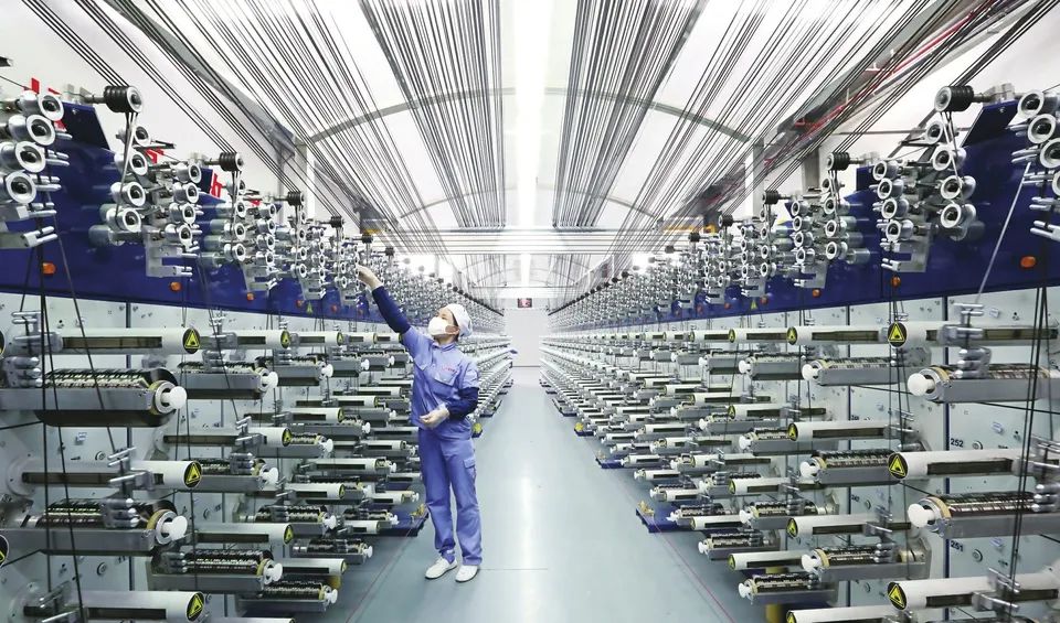 今年会西宁万吨碳纤维生产基地的车间,工人正在检查智能化生产线卷绕情况