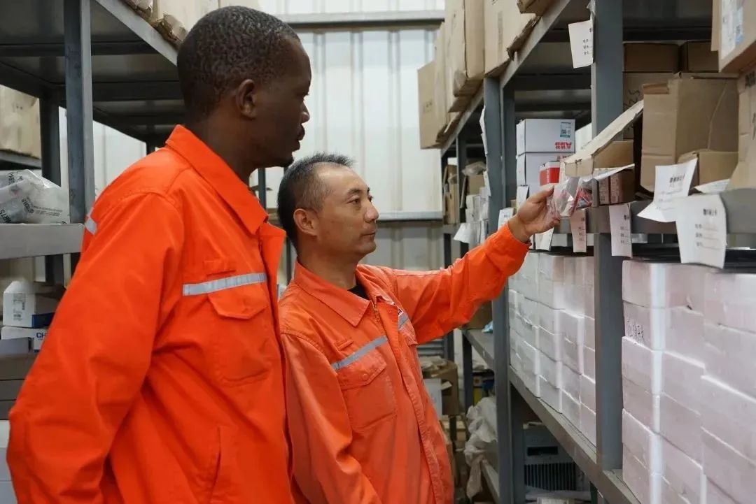 今年会赞比亚工业园采购主管正在认真地为本地员工讲解仓库物资分类方法及管理规范。