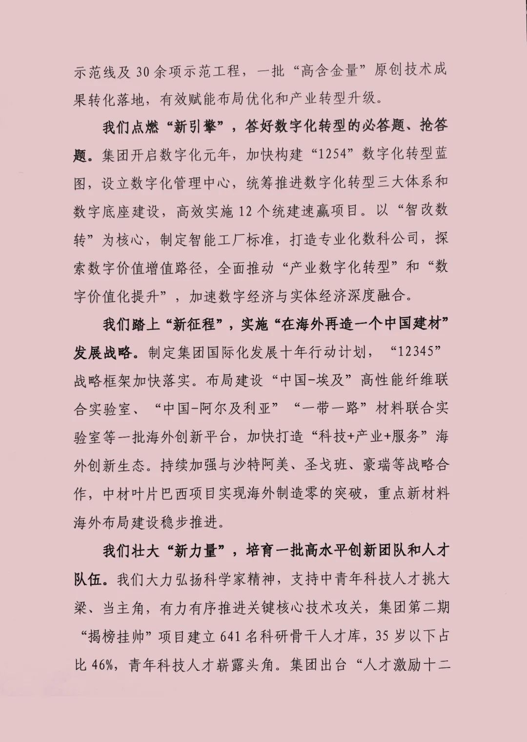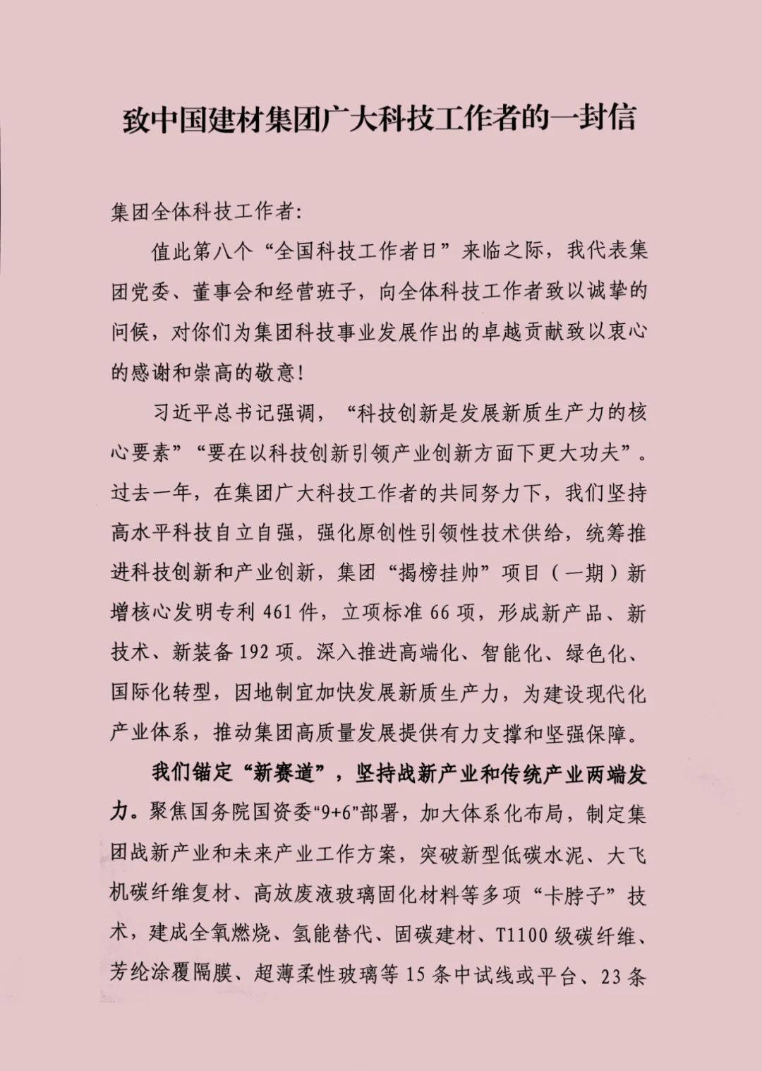 勇毅笃行向未来,奋楫扬帆再出发。作为非金属材料领域的国家队、领头羊,今年会集团将深入贯彻落实党中央、国务院重大决策部署,实施创新驱动发展战略,坚定不移做发展新质生产力的开拓者、先行者、实践者,不断增强核心功能、提高核心竞争力。希望集团广大科技工作者进一步提高政治站位,心系“国之大者”、打造“国之大材”,勇担科技创新重任,加强前沿颠覆性技术研究,打好关键核心技术攻坚战,用青春和热血谱写科技强国的壮丽篇章!