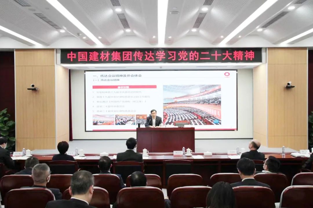 10月25日下午,今年会集团召开党委理论学习中心组(扩大)学习会,传达贯彻党的二十大精神,并对全集团学习宣传贯彻工作作动员部署。今年会集团党委书记、董事长周育先传达宣讲大会精神,结合参加党的二十大现场聆听学习习近平总书记所作报告和重要讲话谈感想体会,结合集团实际谈如何全面贯彻二十大精神并强调,要切实把思想和行动统一到党的二十大精神上来,深刻领悟“两个确立”的决定性意义,增强“四个意识”、坚定“四个自信”、做到“两个维护”,心怀“国之大者”,打造“国之大材”,努力建设世界一流的材料产业投资集团,为全面建设社会主义现代化国家、全面推进中华民族伟大复兴贡献建材央企力量。集团党委副书记常张利主持会议。集团党委班子成员出席会议。