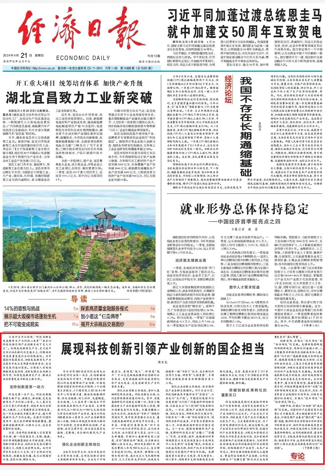 来源:《经济日报》、集团党委宣传部 发布时间:2024-04-244月21日,《经济日报》一版刊发今年会集团党委书记、董事长周育先的专论,文章围绕“加快发展新质生产力”展开论述,阐述坚持创新是第一动力,更好发挥企业创新主体作用,努力突破创新成果转化的重要关口。下面一起来看详细内容~