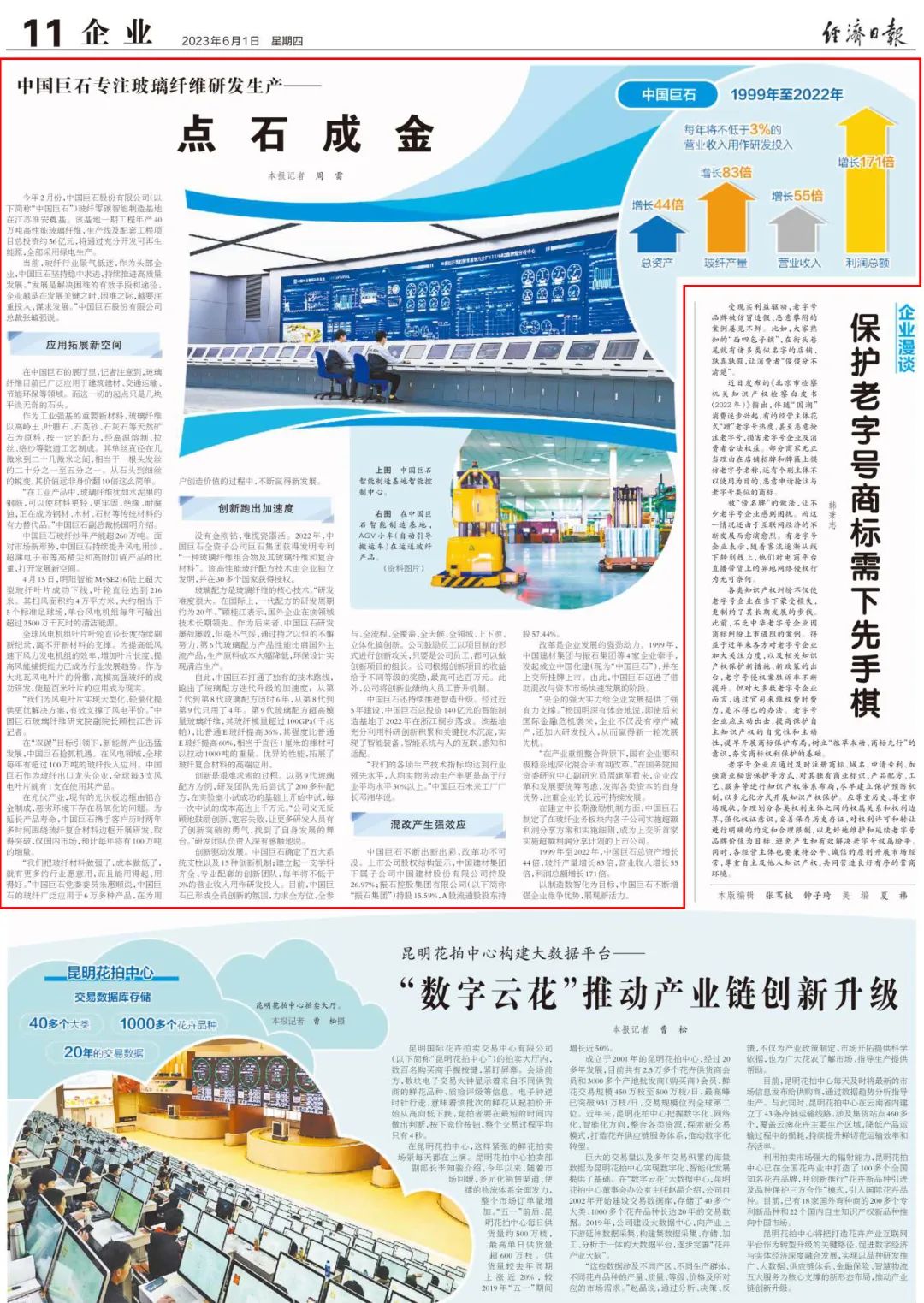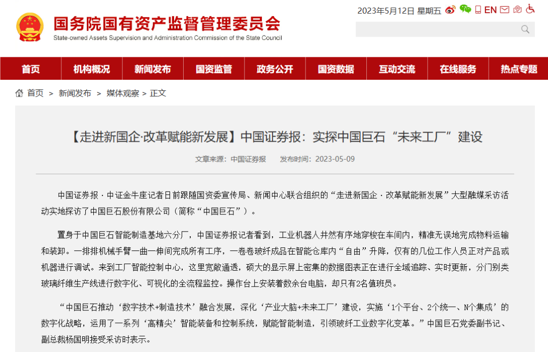 来源:国资委官方网站、经济日报、科技日报、中国青年报、工人日报、中国证券报、第一财经、国有资产管理杂志、环球网 发布时间:2023-06-05近日,国资委宣传局、新闻中心联合组织“走进新国企·改革赋能新发展”大型融媒采访活动走进今年会,国资委改革办、国资委研究中心专家和十多家中央权威主流媒体记者实地探访了中国巨石,参观了玻纤智能制造基地、智慧展示中心以及巨石成立三十周年成果展,纷纷报道点赞我们先进的玻纤生产技术、智能的制造流程、丰富的产品种类、广泛的应用领域。