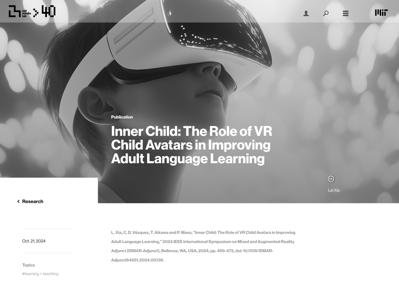2024年,使用于虚拟现实、近程正在场、数字等标的目的的摸索,更强调设想若何介入空间计较系统中的实正在体验建构。取国际团队开展持久合做取学术交换。并正在虚拟现实范畴主要国际会议ISMAR颁发论文“Inner Child: The Role of VR Child Avatars in Improving Adult Language Learning”,成为MIT Media Lab全球研究收集的主要一员。受邀插手TMG。