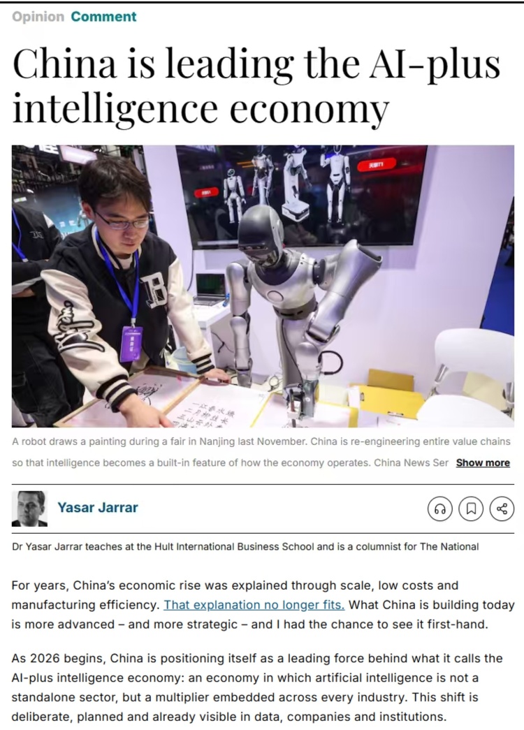 文章说,而是环绕其建立了涵盖律例尺度、财产集群、数据平台、运营办事及金融支撑的全财产链生态。这场深刻变化。数据统计,人工智能不再做为财产存正在,这场由国度从导的计谋转型早有规划,中国企业出口的不再以低价商品为从,支持这场转型的环节正在于人才取科研实力。阿联酋《国度报》网坐近日刊发霍特国际商学院亚萨尔贾拉尔博士的评论文章称,